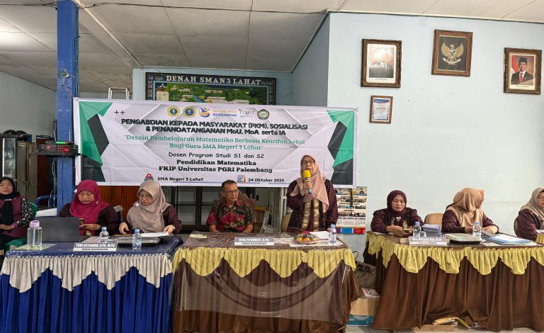 Tim dosen Program Magister dan Sarjana Pendidikan Matematika Fakultas Keguruan dan Ilmu Pendidikan (FKIP) Universitas PGRI Palembang melaksanakan kegiatan Pengabdian kepada Masyarakat (PkM) di SMA Negeri 3 Lahat dengan tema “Desain Pembelajaran Matematika Berbasis Kearifan Lokal bagi Guru SMA Negeri 3 Lahat.” Kegiatan ini menjadi wujud nyata pelaksanaan tridarma perguruan tinggi dalam mendukung peningkatan kompetensi profesional guru sekaligus melestarikan budaya lokal Sumatera Selatan.